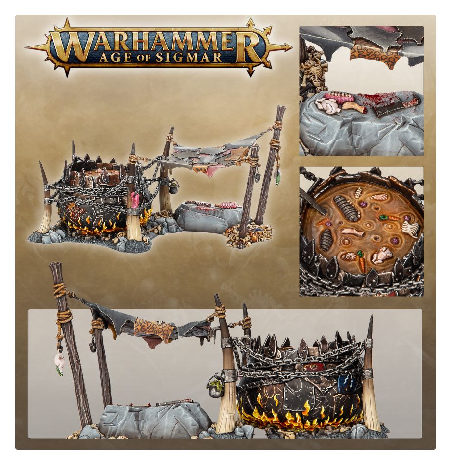 Crafted from the melted-down weapons of defeated enemies and blessed with the strange, hungry essence of the Gulping God, the Great Mawpot is a Mawtribe’s most sacred possession. All manner of gruesome ingredients are thrown into this metal cauldron and boiled up into a thick magical broth that reinvigorates any ogors who taste it.