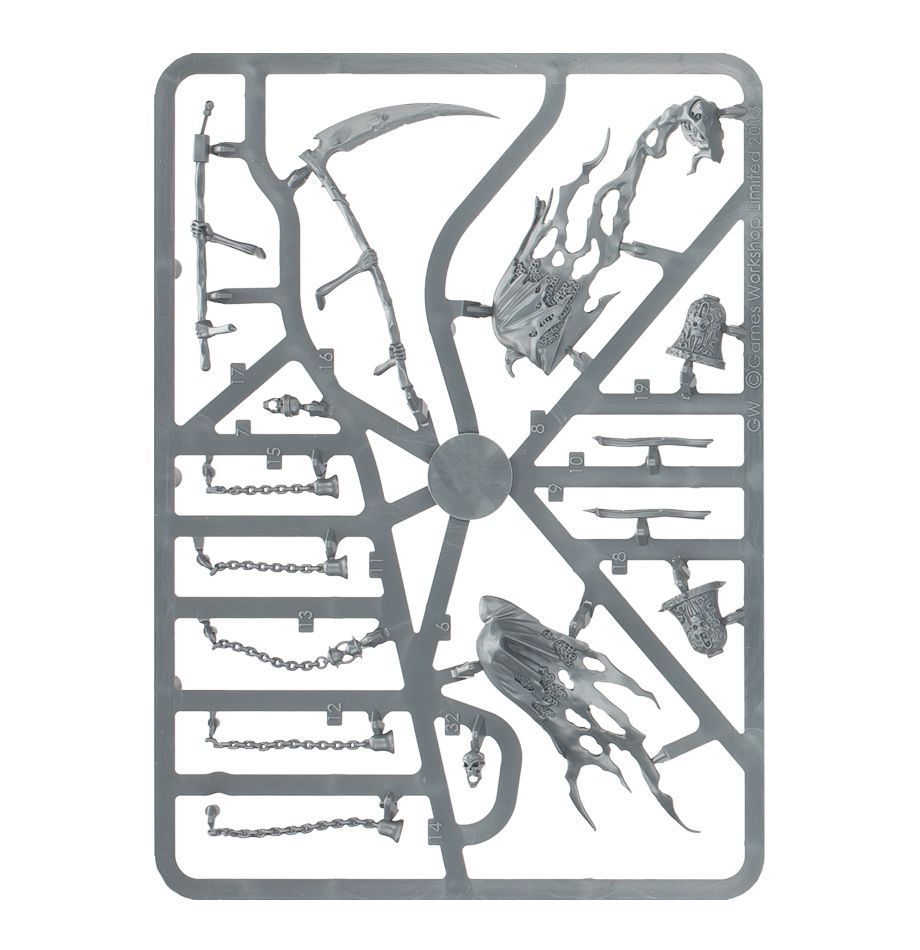 In life, those who were to become Grimghast Reapers were careful and meticulous killers. In death, they never cease in their long, sweeping strokes that mercilessly cut the enemy down a rank at a time, and they never tire. Like clockwork, they endlessly repeat their deadly shearing strikes. The grim spectres move quickly, hovering down to attack, doing so with jarring motions antithetical to the graceful movements of the living. They seem to start and stop, travelling in convulsive bursts; but they are fast for all that.