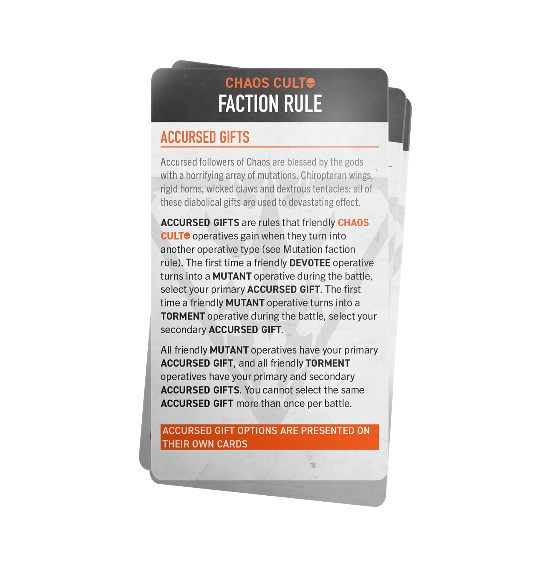 This pack contains the rules you’ll need to deploy your Chaos Cult operatives in games of Kill Team. Inside you will find team rules displayed on handy reference cards, including team selection rules, operative datacards, faction rules, strategy and firefight ploys, faction and universal