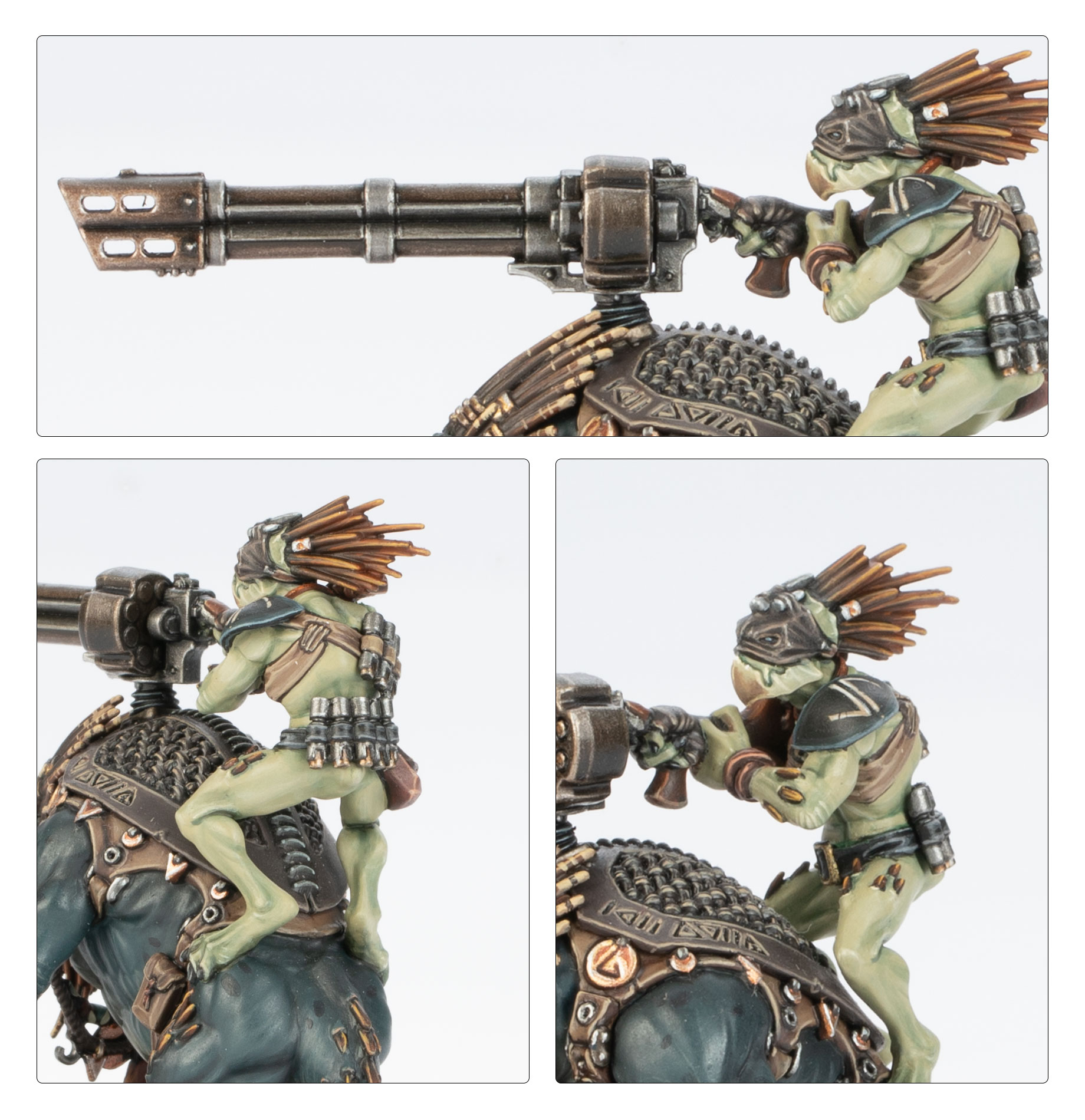 Krootox Riders are living gun platforms, loaded with armaments that would be far too bulky for light-footed Kroot infantry. Though the Krootox are not naturally aggressive, these powerful beasts regard their fellow Kroot as packmates, and will lash out with fearsome strength to defend their kin. Guided by gunners who sway atop their steeds in sturdy harnesses, they lumber into battle to provide mobile fire support for aggressive hunting packs.
