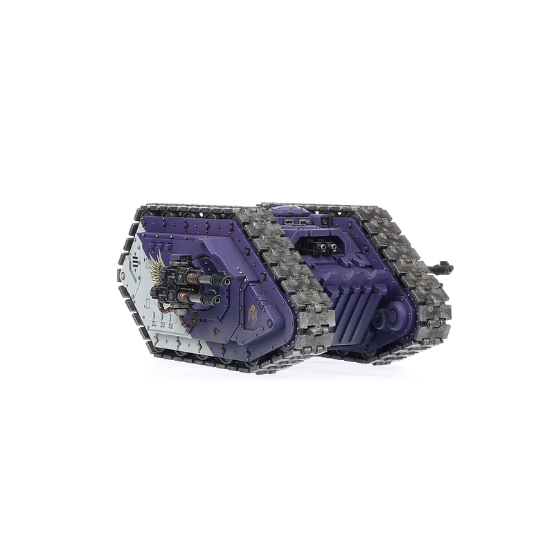 The Land Raider is regarded by many as the finest armoured fighting vehicle of its class in the Imperium’s arsenal, and is the mainstay battle tank of the Space Marine Legions. It is a phenomenally powerful war machine, its multi-layered composite armour and reinforced hull all but impervious to even heavy weapons, being a sealed unit designed to resist enemy attack from any approach. Intended to serve in almost any environment as both war machine and exploration vehicle, it can operate freely in war zones ranging from acid swamps to rad-deserts without any noticeable impediment to its