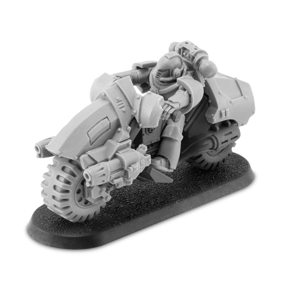 Outrider squadrons are mechanised Space Marine reconnaissance squads who take to the field of battle mounted on ruggedly-constructed ground bikes. Equipped with roaring bolters or fearsome plasma guns, Outriders are used for rapid encirclement as well as hit-and-run attacks against targets of opportunity behind enemy lines. Their chief advantage is speed and mobility, their bikes enabling them to cover ground far faster than infantry.