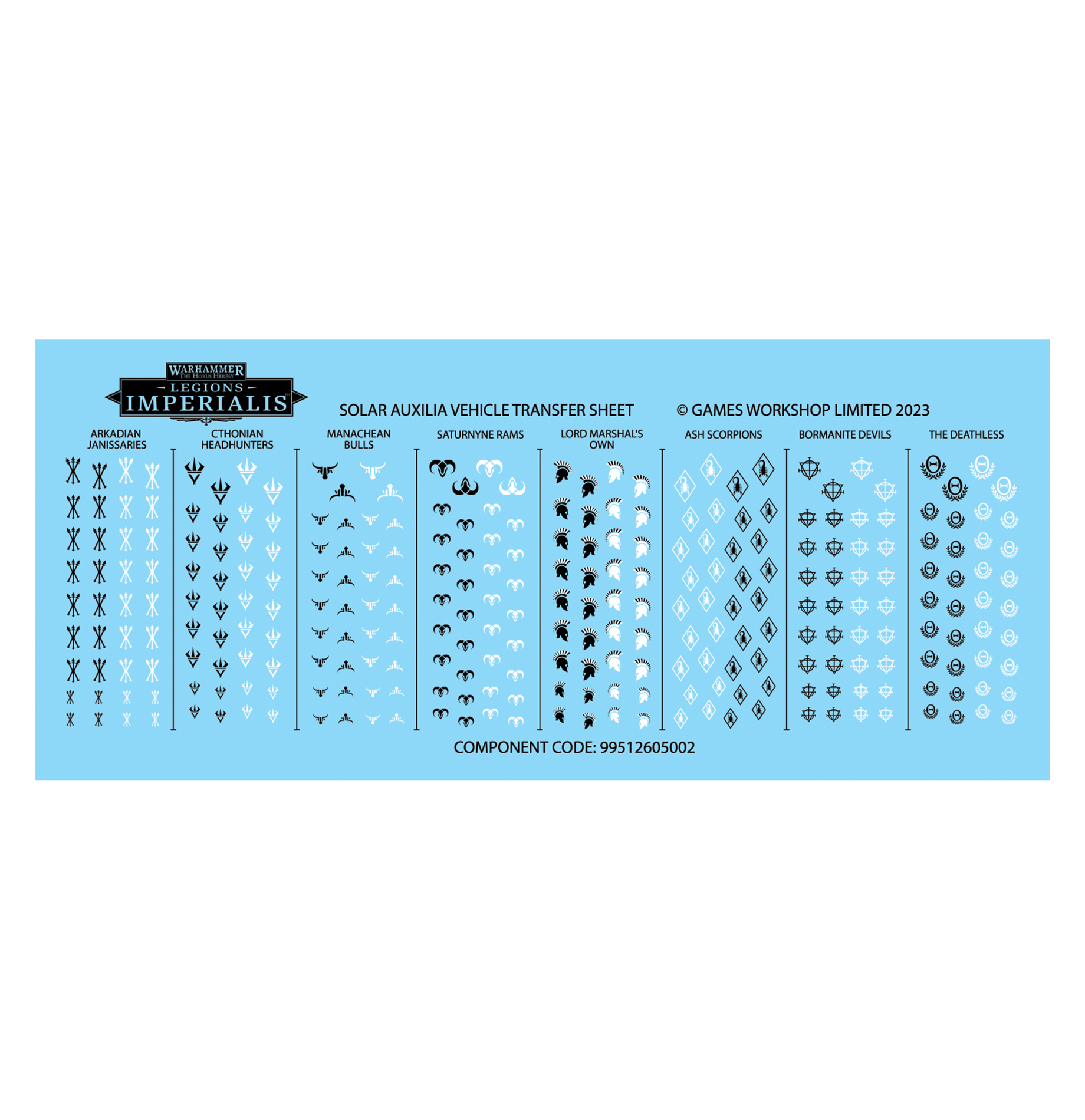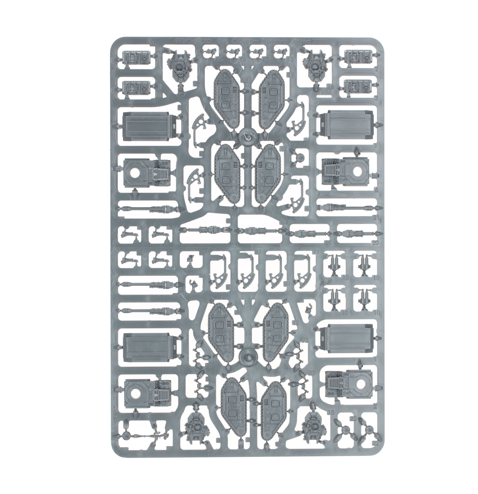 This multipart plastic kit builds eight epic scale Solar Auxilia Leman Russ Tanks, reliable war machines for the battlefields of Legions Imperialis. Each tank can be built with a battlecannon or Vanquisher battlecannon mounted on its turret, along with a choice of hull-mounted gun – either a heavy