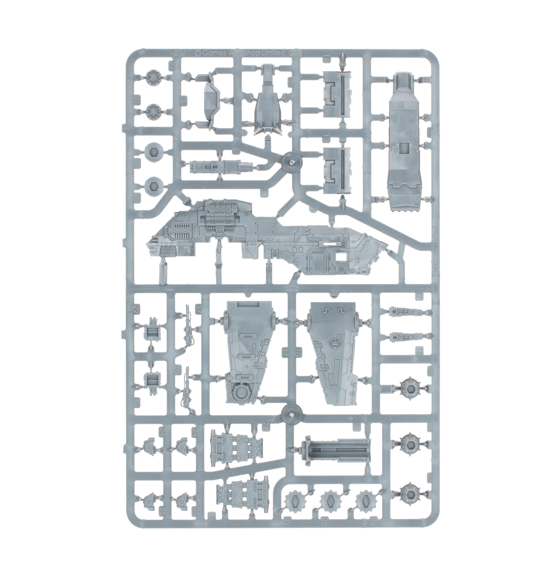 This multipart plastic kit builds an epic scale Thunderhawk Gunship. This airborne behemoth’s primary weapon is a dorsal turbo-laser destructor, while its fuselage and wings each support a pair of heavy bolter turrets for lighter targets. It also boasts a