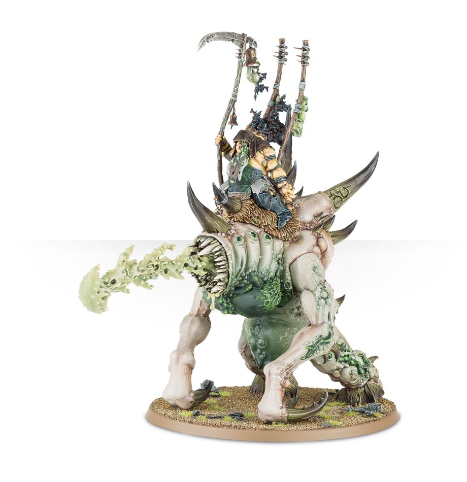 Riding into battle atop a monstrous Maggoth, whose three rotting, putrid tongues lash through the air to impale and choke any who stand in their way, Morbidex Twiceborn is a powerful warrior of Chaos indeed. Wherever he rides, a giggling cloud of daemon mites spill forth to overwhelm the enemy in a mischievous tide of disease and filth.