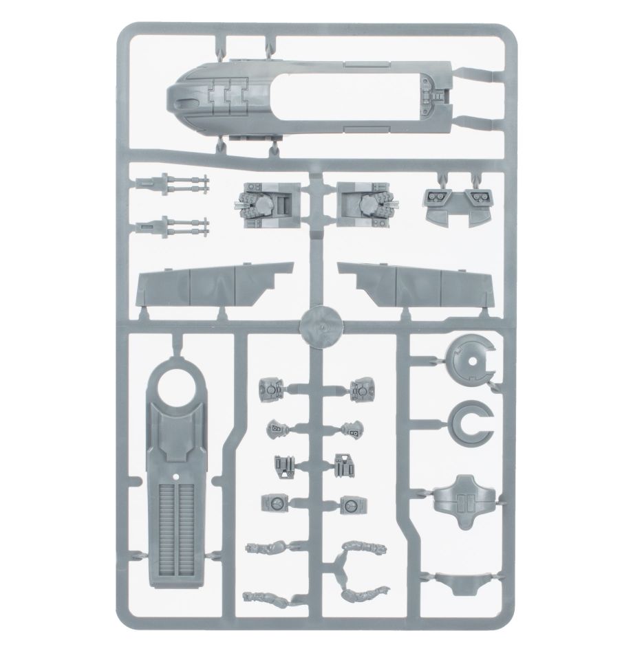 This multipart plastic kit builds a Piranha – a light flying vehicle employed by the T’au Empire. This deadly skimmer comes with two gun drones which may be attached to its wingtips, or may be built to fly separately. The drones are armed with deadly twin pulse carbines, and you can equip the Piranha with