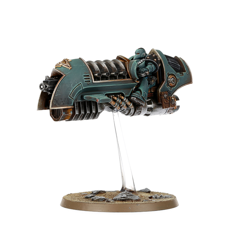 Scimitar Jetbikes make feared strike units. These high-speed craft are more akin to compact aircraft than ground bikes – propelled across the battlefield by jet engines with grav-impellor assistance, they can maintain great speeds for extended periods of low-altitude flight. The jetbike’s lift-strength is enough to carry an armoured Space Marine and his wargear along with a variety of heavy weapons mounts and stocks of ammunition, giving the Sky-hunters access to extremely potent, highly mobile firepower.