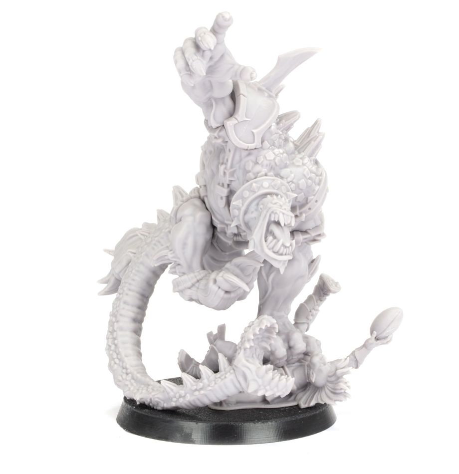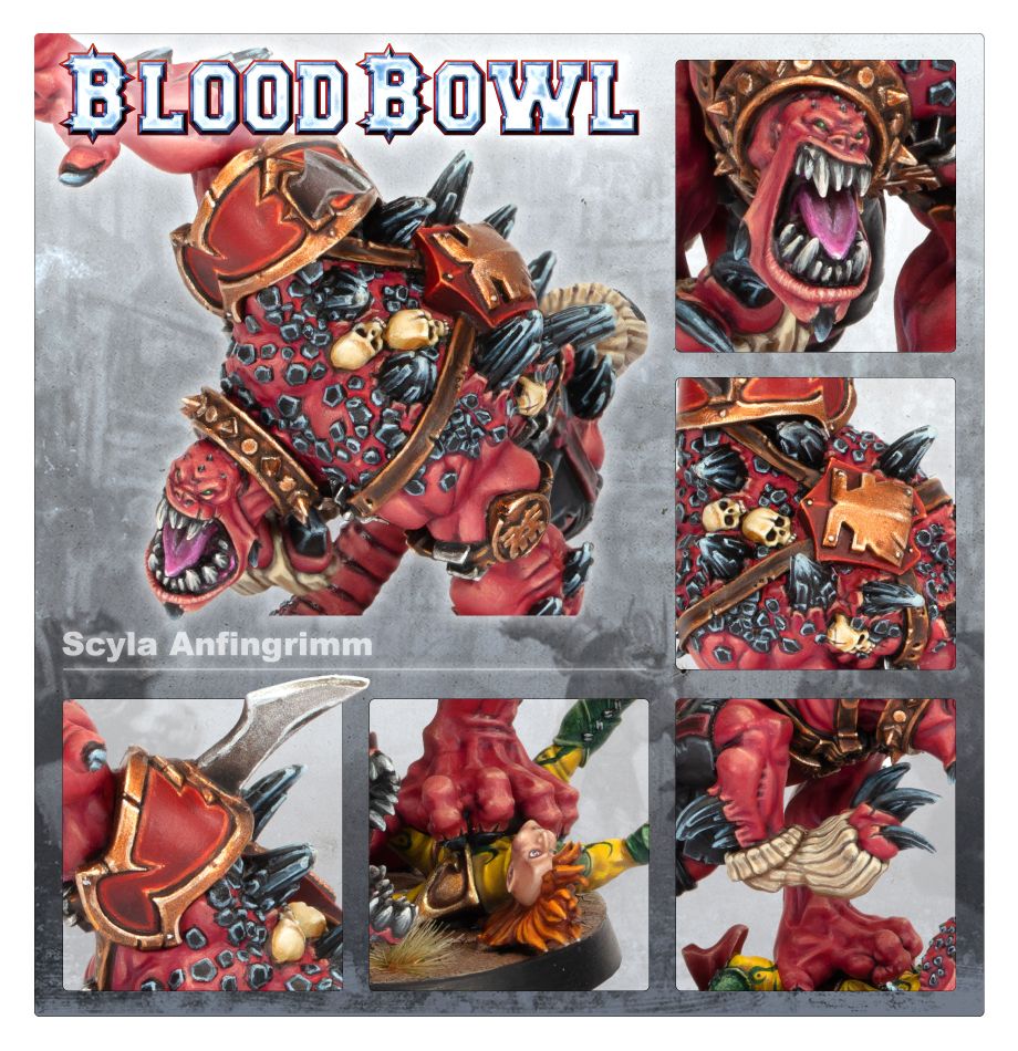 The fate of Scyla Anfingrimm is a cautionary tale to any who would accept the blessings of the Blood God too readily. Scyla bears many such gifts, from a prehensile tail ending in a tooth-lined maw to a spiked, brass collar – an iconic sign of Khorne’s favour – about his neck. Yet even though his body has devolved beyond all recognition, Scyla Anfingrimm’s power is beyond question, and the devastation he leaves in his wake on the astrogranite has made him a living legend.