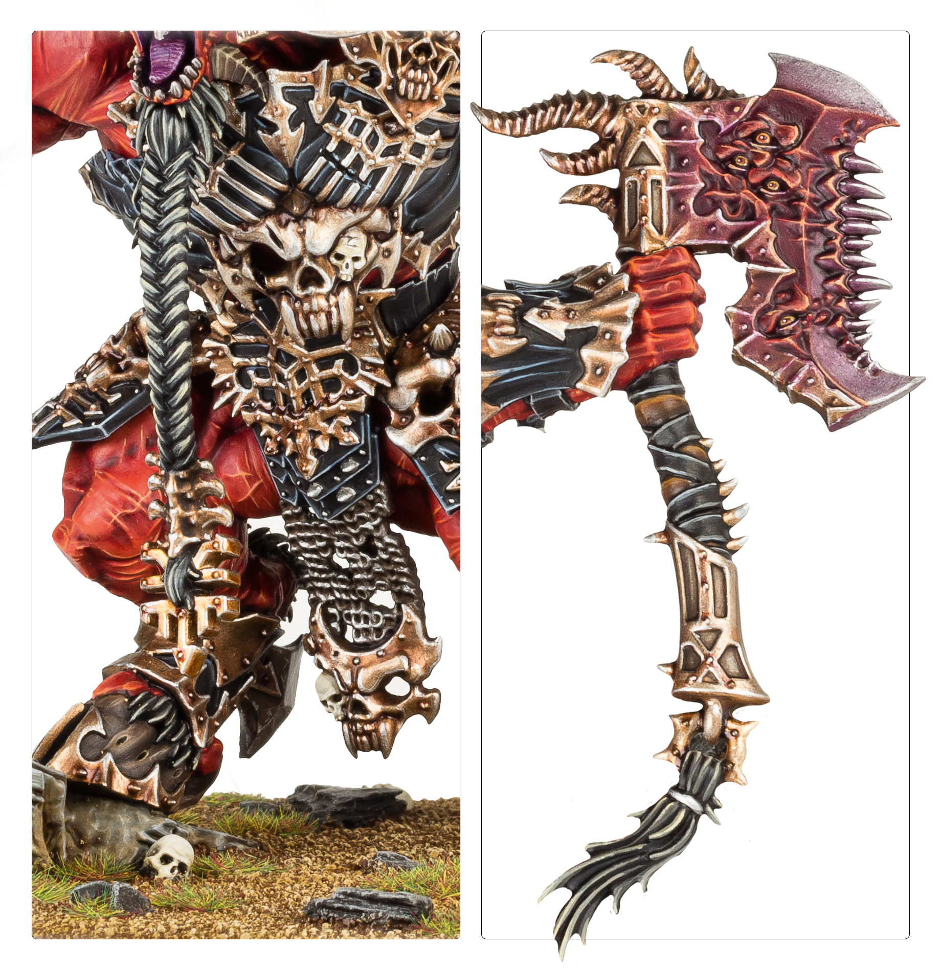 Skarbrand storms across realspace, never pausing, never relenting, hacking apart every luckless foe in its path. Worse, all who find themselves in the presence of the daemon are seized by its feral murderlust, a madness that sees even elegant strategies collapse into clashes of primal savagery.