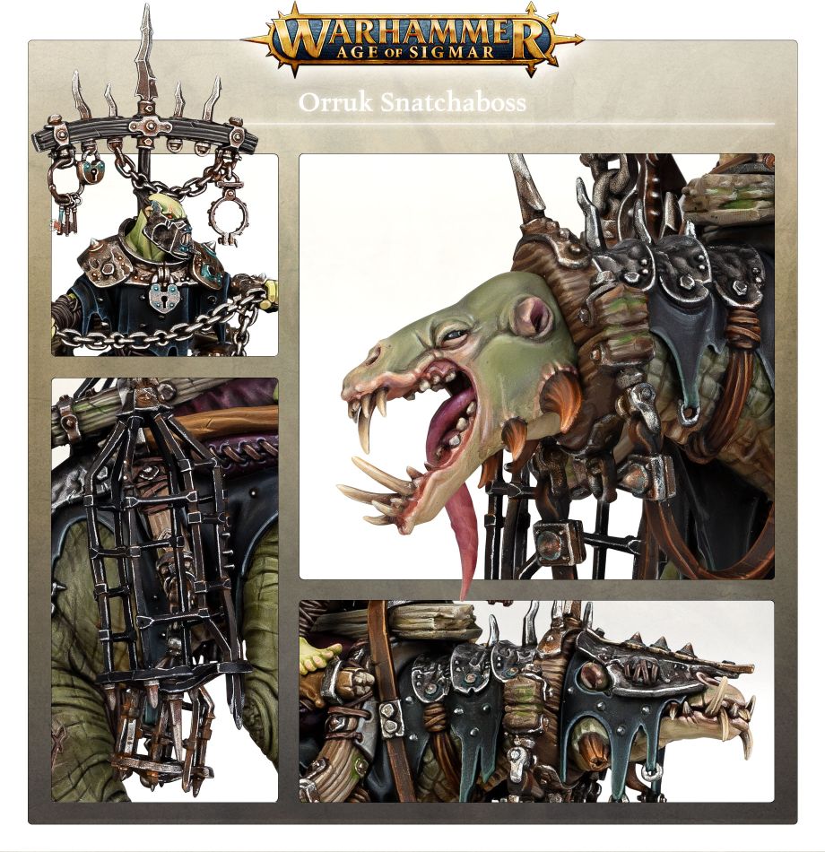 Only the wiliest of Snatchabosses have the know-how to capture a sludgeraker beast. Despite their size, these formidable carnivores employ stealth to stalk the swamps for prey, lurking in the mire and carefully staying upwind of their mark to hide their unimaginable stench. In battle, they are deceptively swift, loping forward as the cages and chains of the Snatchaboss rattle and clank above the din of combat, a grim chiming that strikes fear into the hearts of those who hear it.
