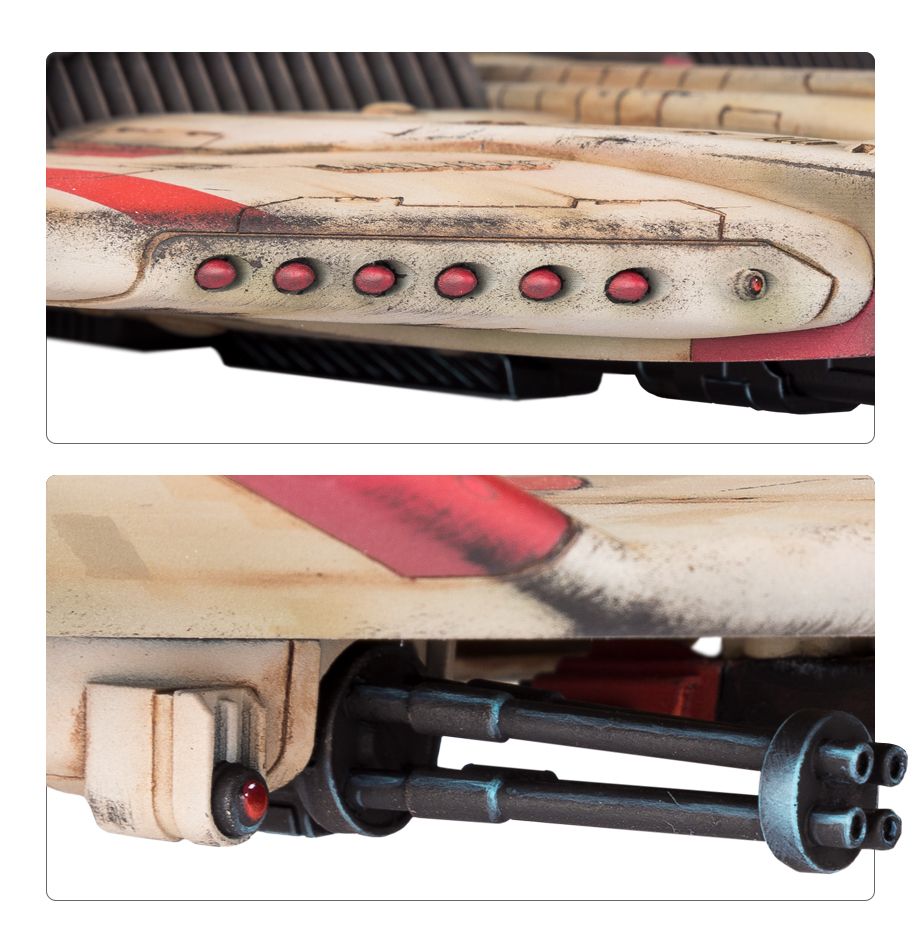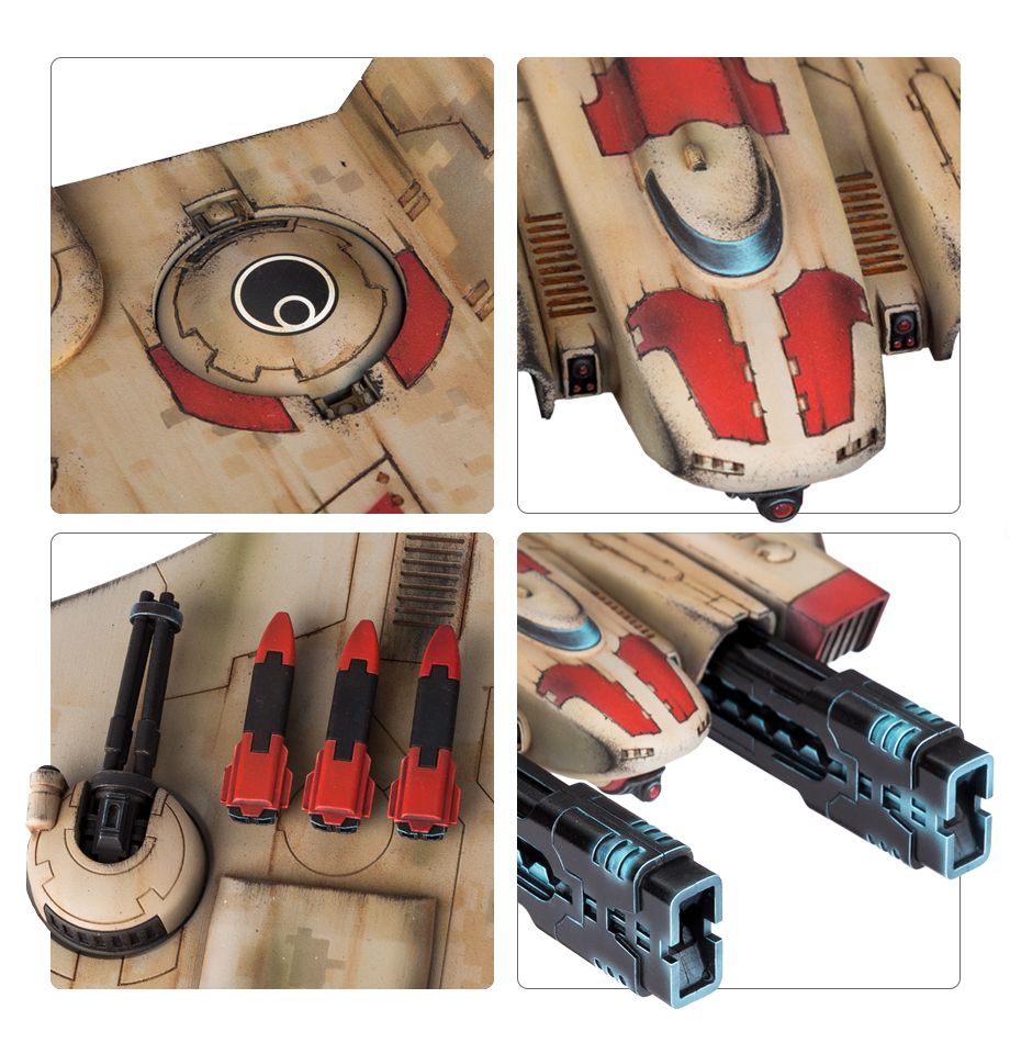 During the Taros campaign, the T’au deployed a new variant of its Tiger Shark fighter-bomber. Codified as the AX-1-0, this heavily armed aircraft replaced its drone racks and ion cannon with two heavy rail cannons and a seeker missile array. These massive weapons, usually mounted on the far larger Manta, turn the Tiger Shark into a formidable ground attack craft.