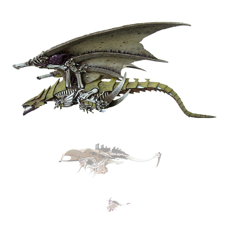 Of the various winged horrors the Tyranids have yet unleashed upon the galaxy, none are as monstrously large or powerful as the Harridan. Borne on huge membranous wings, each tipped with a ruinous bio-cannon, they swoop through enemy lines like harbingers of doom, carving through troops and armour with their gargantuan scything talons. Foes who attempt to return fire face a shower of squirming fleshborers, for the Harridan plays host to whole broods of hissing Gargoyles – these winged swarms cling bat-like to the bio-titan’s underbelly, borne across greater distances than their own wings