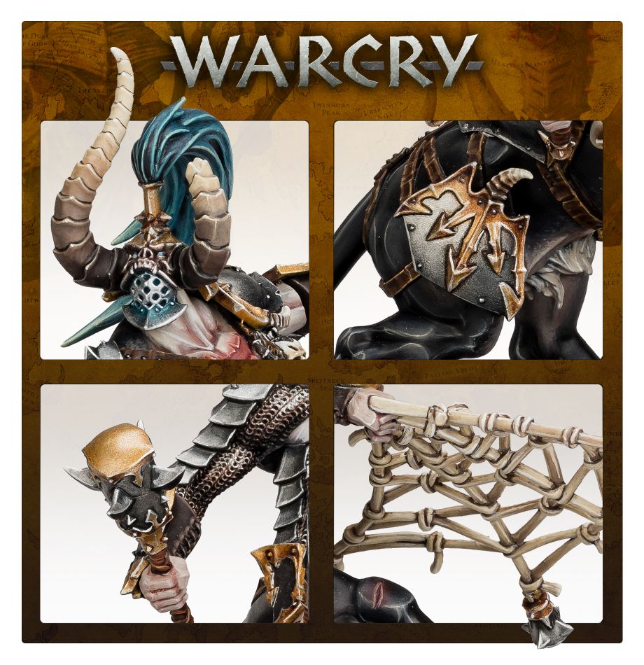 Centaurions are terrifying creatures, their strength and skills honed in the Varanspire’s warpits. Charging headlong into the fray on iron-hard hooves, Centaurions wreak havoc with each of the deadly weapons gripped in their four arms – ensnaring, skewering, bludgeoning, and trampling any who stand before them. The Marshals are the strongest amongst their kind, risen from the arena into the ranks of powerful warbands and legions – yet despite their bestial ferocity, these are also creatures of great cunning and subtlety, sworn to gather warbands in shadowy service to their Dark